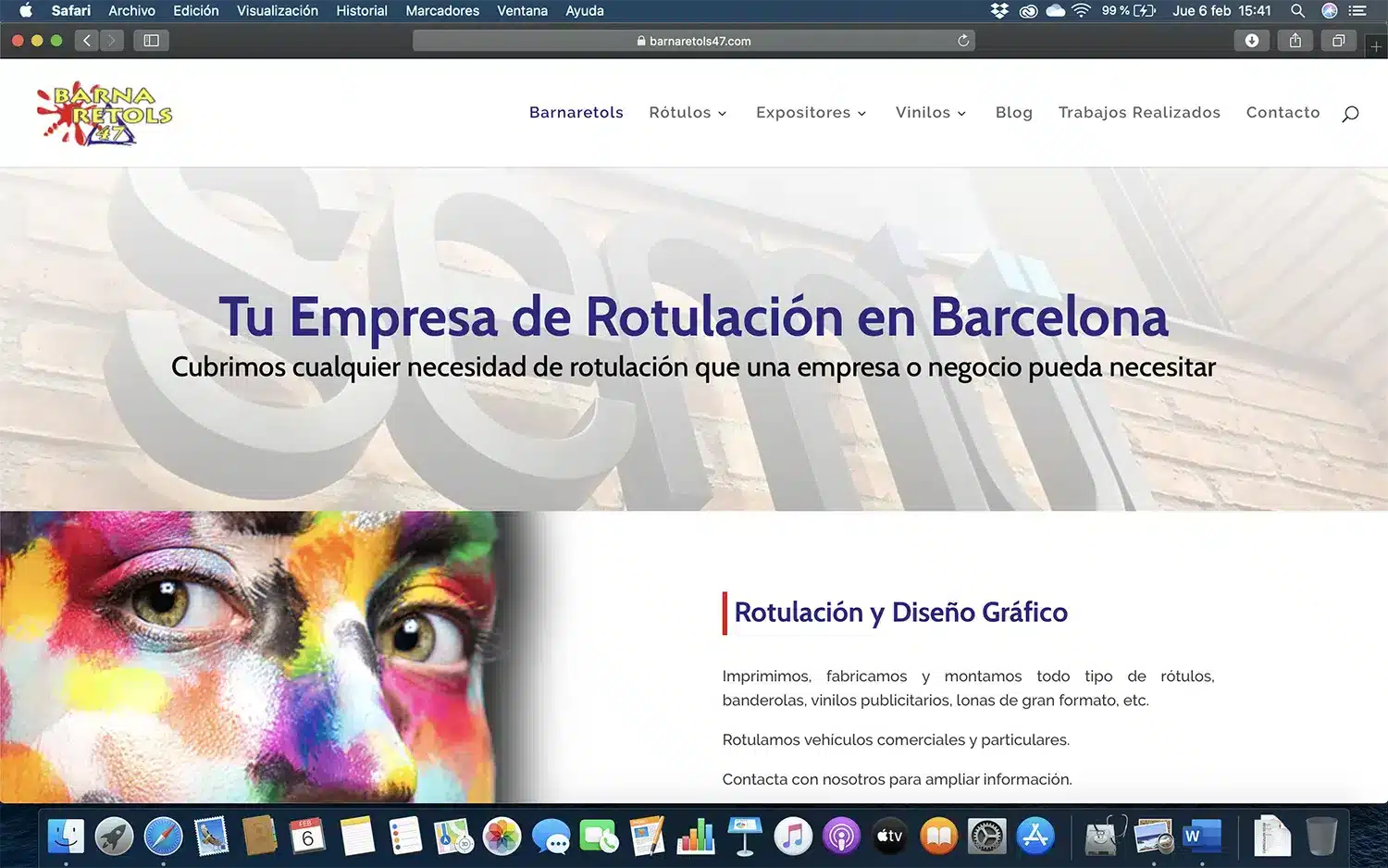 A més a més de realitzar un nou disseny web retolació, s’ha reestructurat del menú principal per facilitar la navegació dels visitants, així com fer més intuïtiu i fàcil de trobar el producte o servei que l’usuari està buscant a la web d’aquesta empresa de retolació. Encara que molt senzilla, compleix les necessitats del client, ja que tots els seus serveis són accessibles des del menú principal. En clicar a qualsevol d’ells es mostra una descripció breu del servei, la forma de contactar i una sèrie d’imatges de treballs realitzats per a aquest servei.